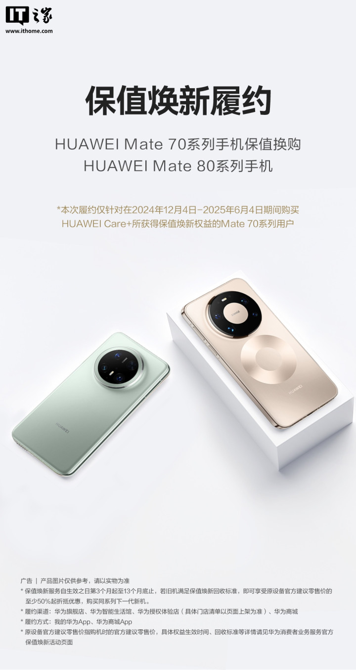 IT之家从官方海报获悉,本次履约仅针对在2024年12月4日-2025年6月4日期间购买HUAWEICare+所获得保值焕新权益的Mate70系列用户。华为保值焕新服务官方介绍如下: